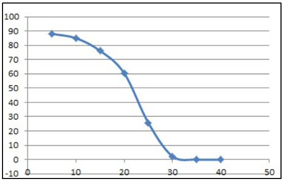 由于來(lái)自固體的核磁共振信號(hào)衰減比來(lái)自液體的核磁共振信號(hào)衰減快得多。因此,可以在FID(下圖)上的兩個(gè)點(diǎn)進(jìn)行測(cè)量,分別在“t1=11us”點(diǎn)進(jìn)行測(cè)量,該點(diǎn)對(duì)應(yīng)固體和液體信號(hào)的總和A1。在另一個(gè)點(diǎn)“t2=70us”進(jìn)行測(cè)量,該點(diǎn)固體信號(hào)已經(jīng)衰減到0,測(cè)試到的信號(hào)A2僅為液體信號(hào)。通過(guò)計(jì)算,即可得到樣品在對(duì)應(yīng)溫度下的固體脂肪含量。對(duì)多個(gè)溫度進(jìn)行測(cè)試,即可得到溫度與固體脂肪的變化曲線。
