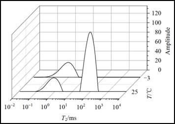 固態(tài)冰與液態(tài)水的核磁共振T2弛豫時間相差很大,冰的T2弛豫時間僅約6us,木材內(nèi)吸著水的T2弛豫時間一般為毫秒級,很容易區(qū)分。核磁共振分析儀是以質(zhì)子為探針,能夠準(zhǔn)確表達多孔介質(zhì)內(nèi)水分含量。通過選擇適當(dāng)?shù)臏囟仁鼓静募毎粌?nèi)自由水產(chǎn)生凍結(jié),此時吸著仍然處于液態(tài),從而可以準(zhǔn)確獲得細胞壁內(nèi)吸著水的信號總量。