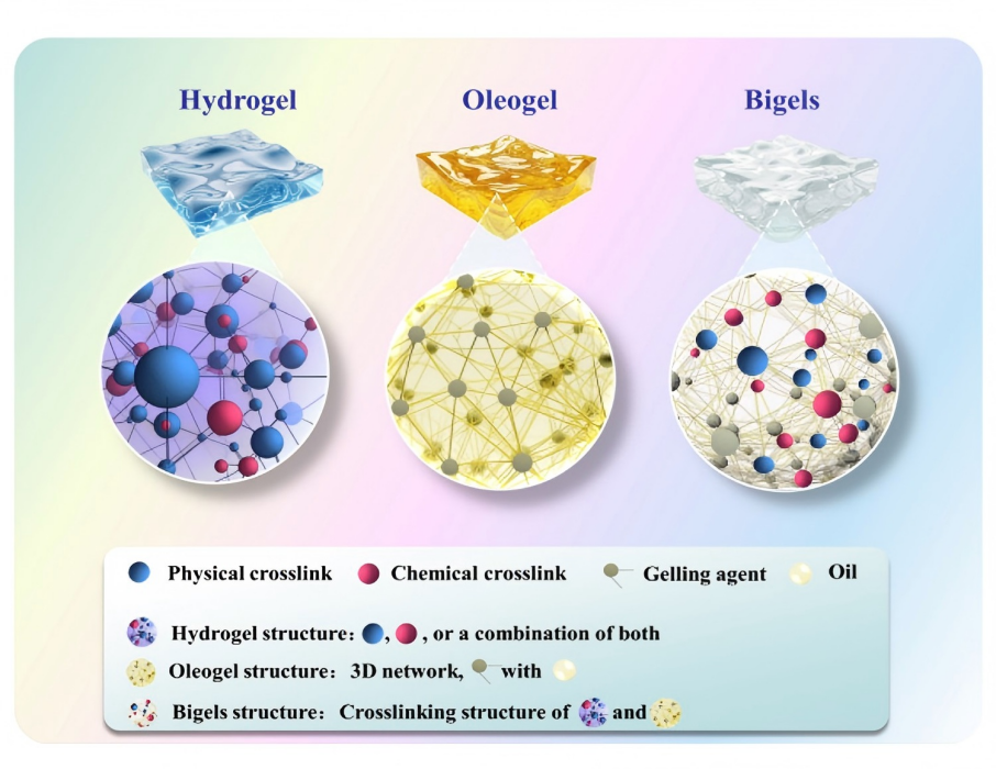 1、結(jié)構(gòu)設(shè)計(jì)對(duì)比: 系統(tǒng)比較雙連續(xù)型雙凝膠與單相包裹型雙凝膠(水包油OG-in-HG或油包水HG-in-OG)在結(jié)構(gòu)性能上的差異。