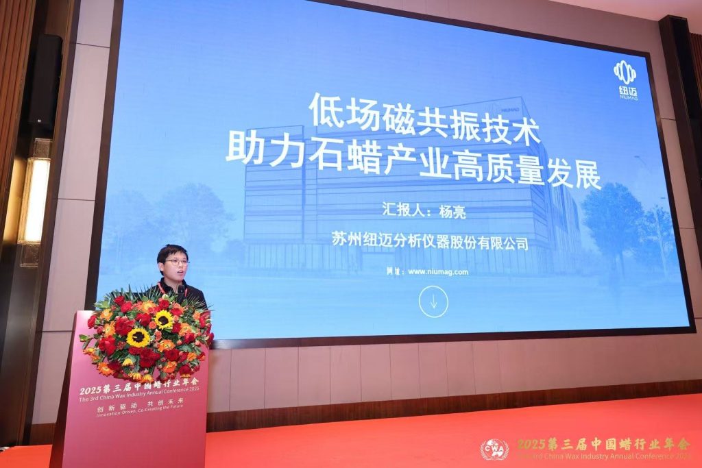 本次年會聚焦蠟行業(yè)高端化、國際化發(fā)展路徑及產業(yè)升級中的關鍵挑戰(zhàn),吸引了眾多行業(yè)專家與企業(yè)代表參與。蘇州紐邁分析儀器股份有限公司攜低場核磁共振技術參加本次會議,公司產品經理楊亮在會議上作了《低場磁共振技術助力石蠟產業(yè)高質量發(fā)展》 的專題報告。