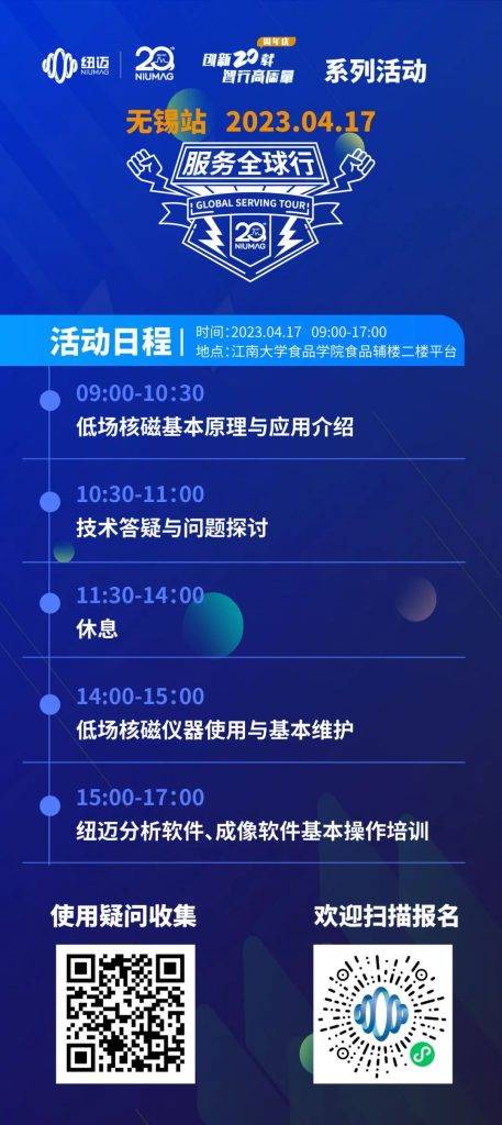 正是江南好風(fēng)景,落花時(shí)節(jié)又逢君。紐邁分析第四屆服務(wù)全球行2023年度活動(dòng)第二站,4月17日(周一)與您相約江南大學(xué),無(wú)錫站。大家在使用設(shè)備的過(guò)程中出現(xiàn)過(guò)哪些問(wèn)題?可以填寫使用疑問(wèn)收集表,我們將會(huì)根據(jù)收集的問(wèn)題來(lái)準(zhǔn)備本次活動(dòng)內(nèi)容。 活動(dòng)內(nèi)容暫定如下,如有調(diào)整,我們會(huì)通過(guò)公眾號(hào)發(fā)布最新日程。請(qǐng)大家持續(xù)關(guān)注紐邁分析公眾號(hào)信息。