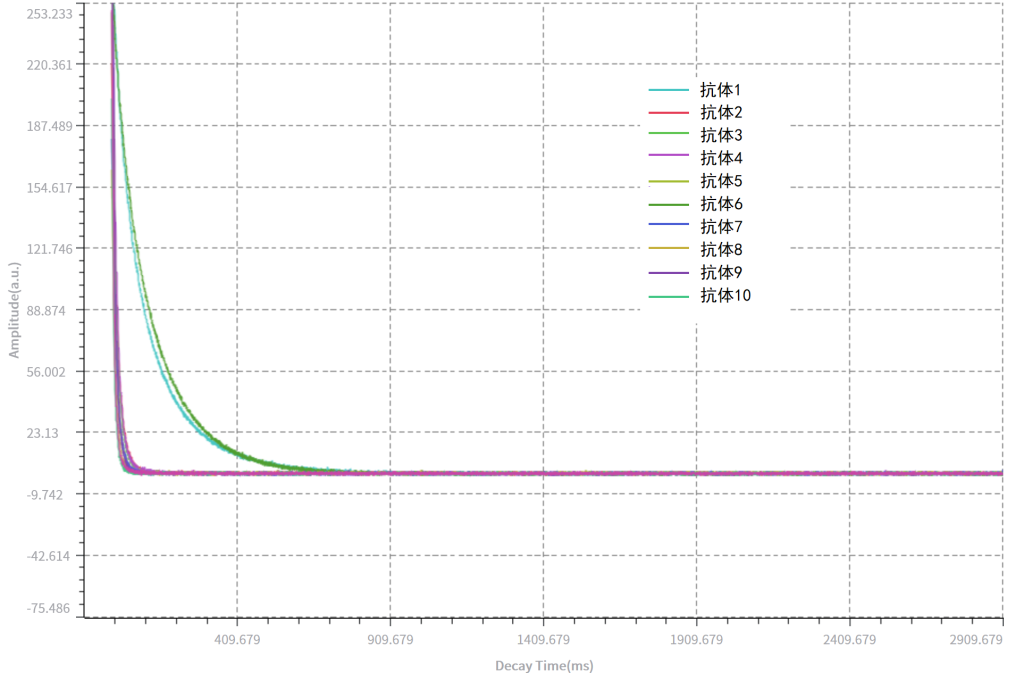 測(cè)試2批次十個(gè)mAb單抗樣品的T2弛豫時(shí)間,可以對(duì)樣品進(jìn)行快速的分類(lèi)和篩選,并且可以明顯區(qū)分不同的抗體樣品。