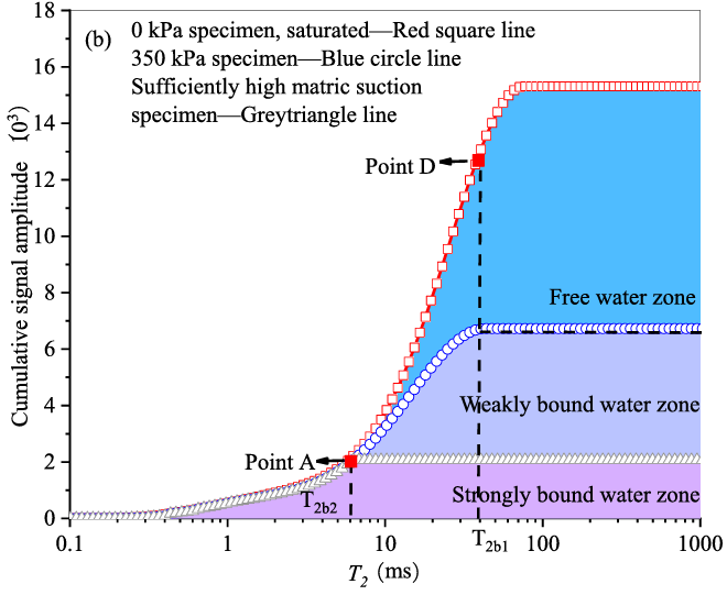 2)強結(jié)合水:所有不同吸力下的曲線都會匯聚于一個不變的點,該點所對應(yīng)的T?值以下的區(qū)域這部分不被排出的水被定義為強結(jié)合水。