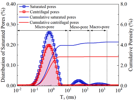 該研究使用低場核磁共振技術,研究了脈沖加載水力壓裂后損傷煤樣的孔隙結構,獲取弛豫譜圖和孔隙度分布信息,有以下結論:圖二表明煤的孔隙度分布隨T2的變化而變化。根據飽和孔隙的累積曲線,微孔的孔隙率約為3.96%,總孔隙率為4.30%。煤樣的峰值飽和孔隙度位于T2=0.76ms處。飽和孔隙率包括被游離水和吸附水占據的孔隙。通??捎猛ㄟ^離心法去除游離水來測量吸附的孔隙率。飽和孔隙和離心孔隙的覆蓋面積之差代表自由孔隙。從累積孔隙率曲線可以看出,吸附孔隙的孔隙率為2.86%,自由孔隙的孔隙率為1.44%。