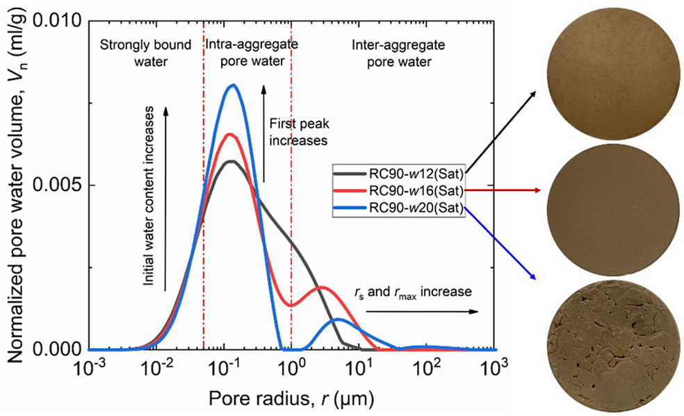 圖三顯示在較低的初始含水率下(w12),曲線呈單峰形態(tài),表明土壤顆粒尚未充分聚集形成團(tuán)聚體結(jié)構(gòu)。當(dāng)初始含水率增至(w16)和(w20)時,曲線轉(zhuǎn)變?yōu)殡p峰形態(tài),這標(biāo)志著土壤顆粒已經(jīng)聚集成團(tuán),形成了典型的“團(tuán)聚體內(nèi)孔隙”和“團(tuán)聚體間孔隙”并存的二元結(jié)構(gòu)。