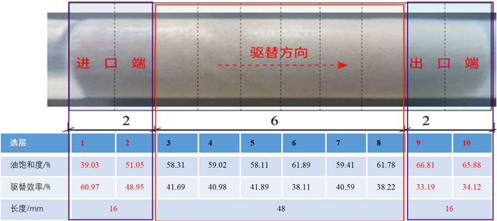 如上圖所示,根據(jù)恒定梯度分層技術(shù),對(duì)每層的巖心的驅(qū)替效率進(jìn)行了評(píng)價(jià),確定端面效應(yīng)的產(chǎn)生為兩端紫色區(qū)域,中間紅色區(qū)域?yàn)榭鄢嗣嫘?yīng)的驅(qū)替段。以上實(shí)驗(yàn)案例可知,總的驅(qū)替效率為41.87%,采用恒定梯度選層技術(shù)扣除端面效應(yīng)后的驅(qū)替效率為40.25%。
