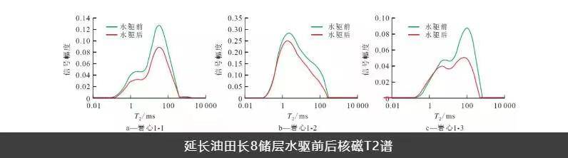 由研究區(qū)長(zhǎng)8儲(chǔ)層巖心樣品驅(qū)替前后核磁共振T2譜可以看出,在水驅(qū)油實(shí)驗(yàn)過程中,油量的減少使得油相弛豫信號(hào)逐漸減弱,T2譜左、右峰幅度均減小,但右峰幅度減小更明顯,表明注入水主要驅(qū)替的是一些大孔隙和中孔隙中的原油。同時(shí)殘余油弛豫時(shí)間小于100 ms,且峰值較高,說(shuō)明水驅(qū)油實(shí)驗(yàn)過程中主要驅(qū)替大孔隙中的原油,而殘余油主要存在于中一小孔隙,大孔隙中分布較少。