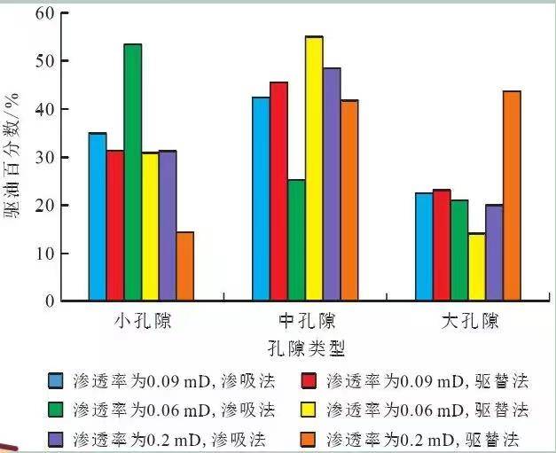 定義不同類型孔隙出油量與總出油量的比值為驅(qū)油百分?jǐn)?shù)。根據(jù)弛豫時(shí)間與孔隙半徑的關(guān)系,可以將水驅(qū)油前后和滲吸前后核磁共振T,譜轉(zhuǎn)換為孔隙半徑,進(jìn)而計(jì)算出驅(qū)油百分?jǐn)?shù),見下圖。