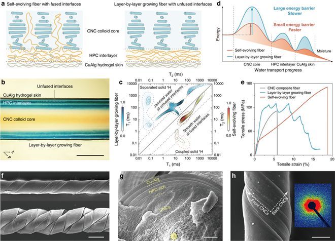 圖2. 水凝膠纖維的自進(jìn)化過程與分層結(jié)構(gòu)表征