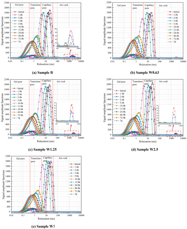 圖三為水化過程中T2譜變化,在前5h內(nèi),T2譜峰全部左移,毛細(xì)血管孔隙和孔隙變化最明顯。過渡孔的峰面積不斷減小,凝膠孔的峰面積逐漸增大。10 h后,弛豫時間均小于10 ms。凝膠孔和過渡孔的峰面積明顯增大,氣孔和毛細(xì)孔消失。24h后,松弛時間和峰面積趨于穩(wěn)定并保持不變。