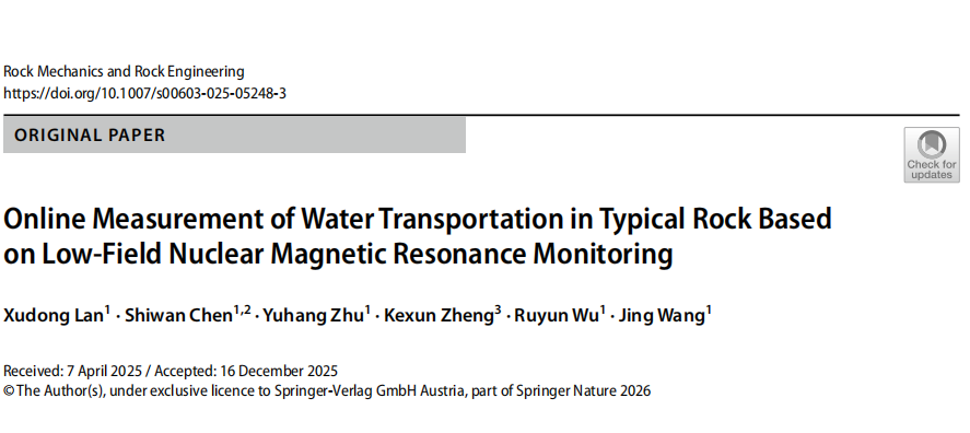 [1] Lan X, Chen S, Zhu Y, et al. Online Measurement of Water Transportation in Typical Rock Based on Low-Field Nuclear Magnetic Resonance Monitoring[J]. Rock Mechanics and Rock Engineering,2026,(prepublish):1-18.DOI:10.1007/S00603-025-05248-3.