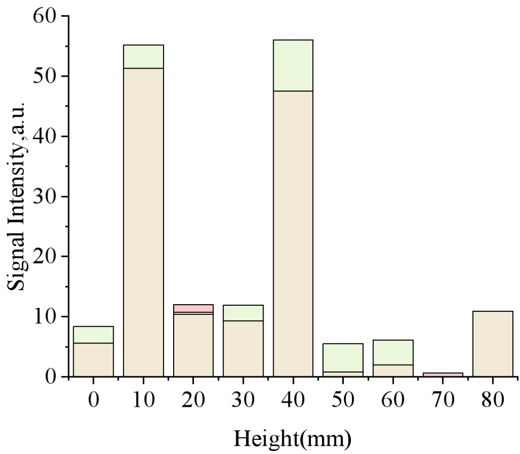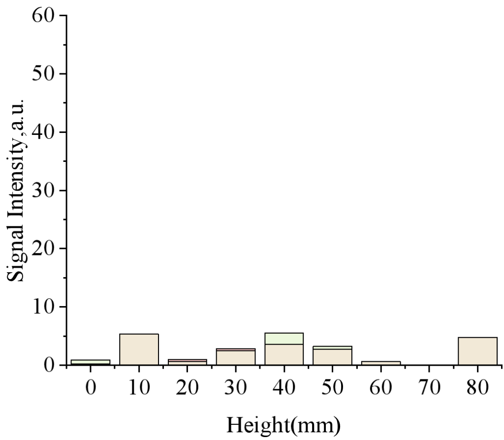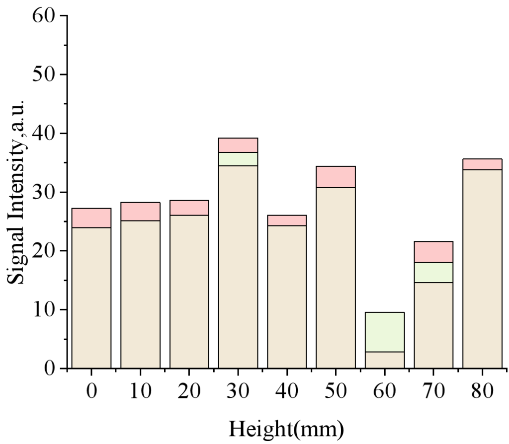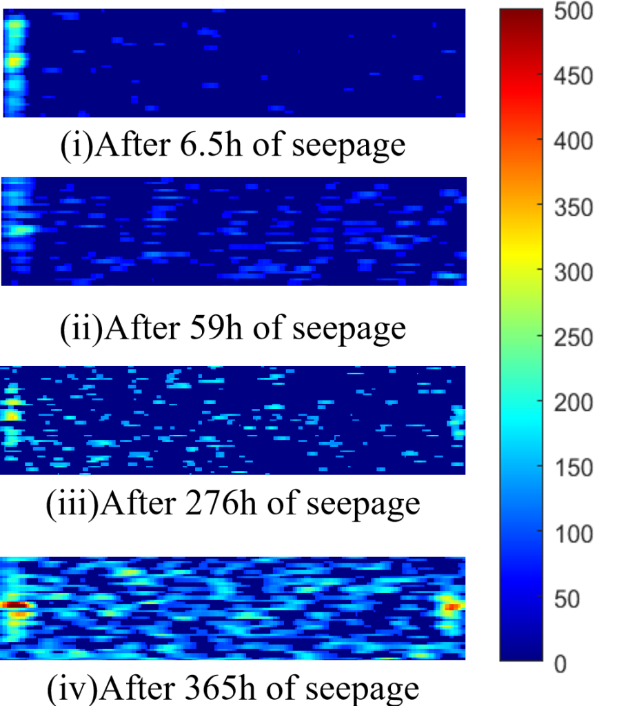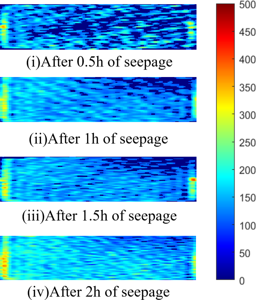 從圖8(b)和圖5(b)可以看出,在滲流早期(6.5小時),短T2在大多數(shù)高度占主導地位,約占總信號量的84.51%,振幅約為14.6。然而,在30mm和70mm的信號量中基本上沒有段T2信號,局部區(qū)域只出現(xiàn)中T2和長T2的峰值。40mm處的中T2振幅迅速增加到12.34,而長T2信號保持在低水平。這表明,在早期階段,水只流過局部微孔或裂縫,整體樣品異質(zhì)性極高—大多數(shù)區(qū)域以致密結構(短T2)為主,只有少數(shù)區(qū)域顯示了流體滲透產(chǎn)生的中孔和大孔T2信號。在中期演化階段(119小時),圖8(c)和圖5(c)顯示,中T2和長T2分布范圍顯著擴大,這兩個分量的明顯信號峰出現(xiàn)在多個長度上。雖然短T2比例降至75.27%,但10mm和40mm處的信號值分別高達51.31和47.47,而中T2信號迅速增加,達到總信號量的24.6%,表明水分入滲范圍擴大,孔隙網(wǎng)絡連通性發(fā)展。但不同地區(qū)之間的差異仍然很大。在滲流后期(365小時),圖8(d)和圖5(d)顯示,長T2在每層上都表現(xiàn)出明顯的信號,不同T2層之間的分布更加均勻,信號幅度約為3,整體信號比例增加到8.78%。短T2的比例保持相對穩(wěn)定,但中T2信號分布僅為4.97%。此時,T2的每一層都呈現(xiàn)出典型的雙峰結構,表明水在巖石中形成了更多相連的流動路徑,孔隙和流體分布的不均勻性顯著降低,趨于均勻。MRI圖像(圖7(a))從另一個角度證實了初始異質(zhì)性和最終均勻化的過程:在6.5小時的早期階段,MRI圖像顯示稀疏和散射的信號,與分層T2譜中的局部中長T2一致,表明水分分布極不均勻。在365小時的最后階段,MRI圖像顯示了廣泛而連續(xù)的信號,對應于分層T2譜所有高度層中長T2的均勻分布,表明在長期滲流后,巖石內(nèi)的流體和孔隙分布趨于更加均勻。