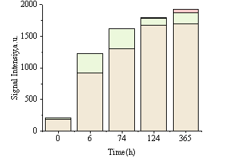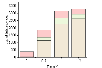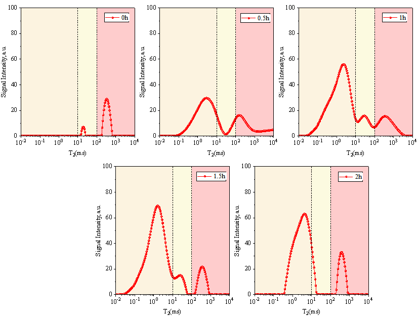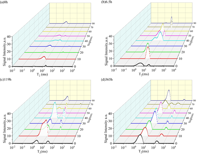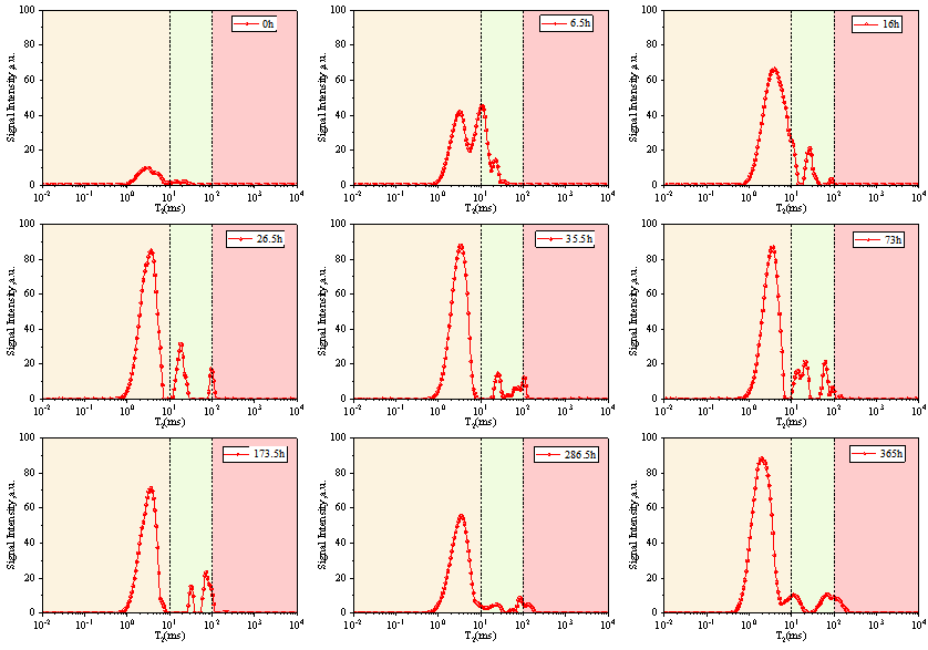 將0.01-10ms設置為微孔,10-100ms設置為中孔,100-10000ms設置為大孔。通過SIRT算法獲得每個T2值對應的振幅(a.u.),并將T2對應的振幅累積在不同的窗口中,以獲得微孔、中孔和大孔的T2面積。累積0小時、6.5小時、119小時和365小時每層的T2譜,如圖8所示的直方圖。