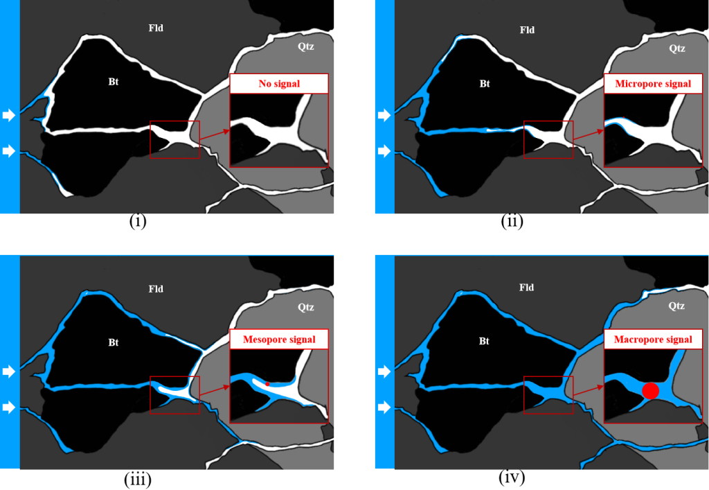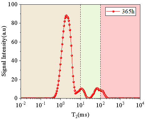 圖3展示了花崗巖在滲透365h后的T2譜分布特征。根據(jù)對應三個峰的T2值,花崗巖的孔隙被劃分為微孔(0.01–10毫秒)、介孔(10–100毫秒)和大孔(100–10,000毫秒)。