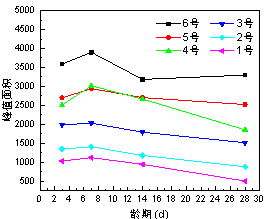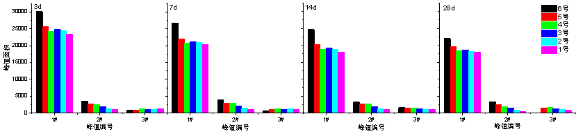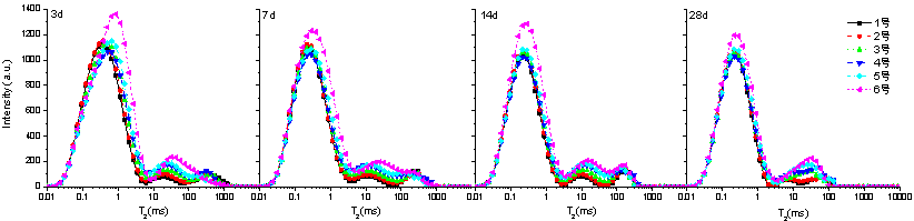 作者利用核磁共振技術(shù)對不同齡期的膠砂試件進行測試,其T2弛豫結(jié)果如圖4所示,T2弛豫譜圖顯示出三個明顯的峰值,分別代表不同相態(tài)的水分。根據(jù)核磁共振原理,峰值頂點對應(yīng)的弛豫時間T2表征水分子的運動性,峰頂點T2越大,則表示該相態(tài)水的運動性越強,被束縛程度越弱;峰值面積表征該相態(tài)水的相對量大小,峰面積越大,則該相態(tài)水含量越多;峰值比例表征該相態(tài)水含量占樣品中總水分的比例,峰比例越大,則該相態(tài)水占比越多。