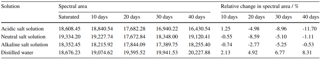 表2展示了不同溶液和浸泡時(shí)間(如0天、10天、20天、30天和40天)下T2譜面積的變化率,以及這些變化如何反映孔隙結(jié)構(gòu)的動(dòng)態(tài)變化,有以下分析: