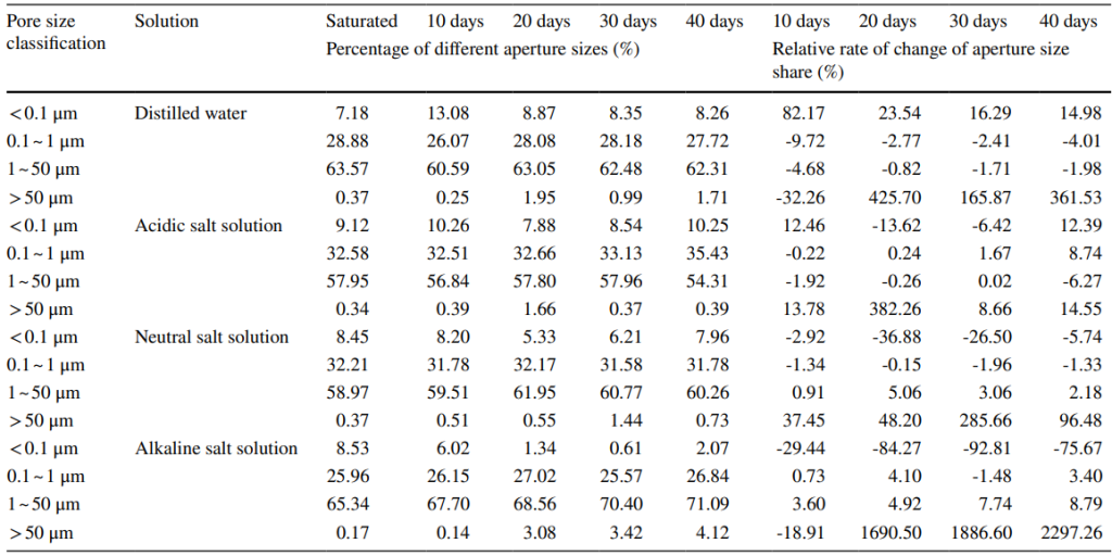 1)孔隙分布變化:在酸性鹽溶液中,微孔和小孔的百分比顯著增加(如從0天的41.70%增加至40天的45.68%),而中孔和大孔減少。這表明酸性環(huán)境促進(jìn)了礦物溶解和孔隙擴(kuò)展。