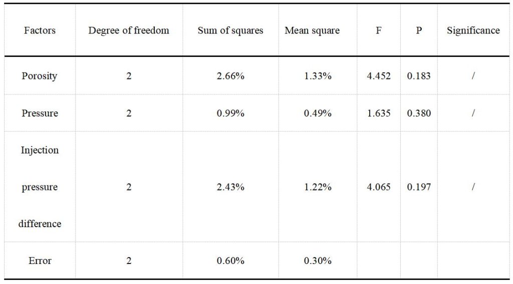 方差分析(ANOVA)與極差分析一起用于評估因子顯著性。雖然方差分析的F值(表2)表明孔隙度>注入壓差>壓力的影響層次,但沒有因素具有統(tǒng)計學意義(p>0.05)。極差分析和方差分析之間的差異源于它們不同的方法論基礎(chǔ)。范圍分析根據(jù)影響大小(R值)的大小對因素進行排名,突出顯示導(dǎo)致殘余水飽和度最大絕對變化的參數(shù),而方差分析通過將方差分量與實驗誤差進行比較來評估統(tǒng)計顯著性(F和p值)。這種差異突顯了這兩種方法在識別具有實際影響和統(tǒng)計穩(wěn)健性的影響因素方面的互補性。