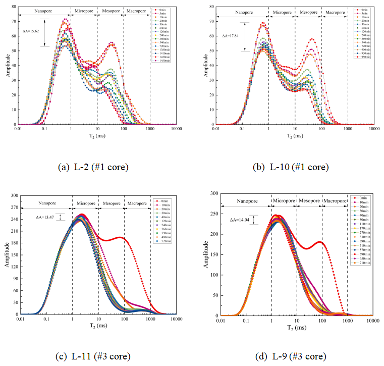 其中R是不同孔徑的含水飽和度,A1是驅(qū)替結(jié)束時T2曲線中納米孔、微孔、中孔或大孔范圍內(nèi)的核磁信號總量,A2是初始T2曲線中的納米孔、微孔、中孔、或大孔的核磁信號總量。