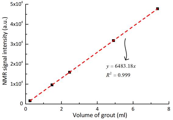 通過對不同體積漿液進行核磁共振測試,可以擬合得到核磁信號強度與漿液體積間的定量關(guān)系,據(jù)此可對注漿過程中進入試樣的實際漿液注入量進行定量反演。