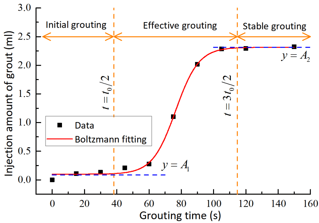 從圖中可以發(fā)現(xiàn),采用玻爾茲曼方程可以很好的擬合漿液注入量與注漿時間的變化關(guān)系。進一步地,通過擬合方程,我們可以定義有效注漿時間(即有效注漿階段的持續(xù)時間)、漿液充填速率(即有效注漿階段曲線的斜率)2個指標對不同條件下注漿滲透擴散特性進行深入分析。