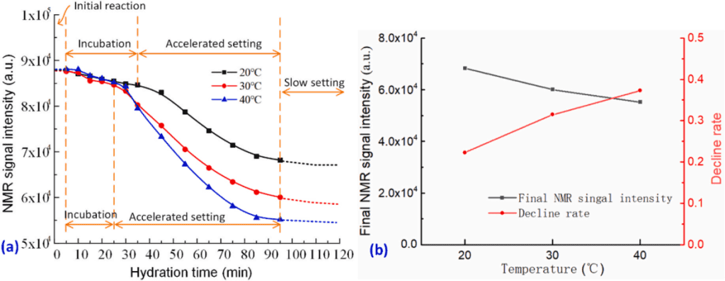 利用核磁共振測試系統(tǒng)對不同溫度下漿液的水化過程進行跟蹤測試,獲得水化過程中漿液的T2核磁信號強度變化,如圖2所示??梢钥吹剑瑵摲趦?nèi),漿液的核磁信號強度緩慢減小,常溫下(即20℃)潛伏期的水化時間范圍為5~35 min,而溫度較高時(如30℃,40℃)潛伏期明顯縮短至5~25 min。潛伏期與漿液的黏度穩(wěn)定期吻合,注漿試驗應(yīng)該盡量利用好漿液在潛伏期良好的流動性,在加速凝結(jié)期開始前完成。