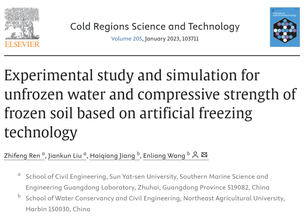[1]?Zhifeng Ren, Jiankun Liu, Haiqiang Jiang, Enliang Wang. Experimental study and simulation for unfrozen water and compressive strength of frozen soil based on artificial freezing technology[J]. Cold Regions Science and Technology, 2023, 205(103711).
