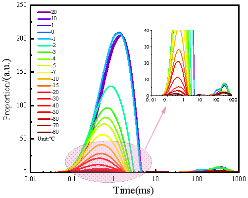 根據(jù)上述冷卻策略對樣品進行冷凍,并在20°C至-80°C范圍內測量核磁共振信號強度。每次NMR測試涉及以下參數(shù):60 mm線圈、CPMG(Carr-Purcell-Meiboom-Gill)射頻序列、250 kHz采樣頻率、15倍模擬增益、3000個回波、0.15 ms回波時間和1000 ms等待時間。