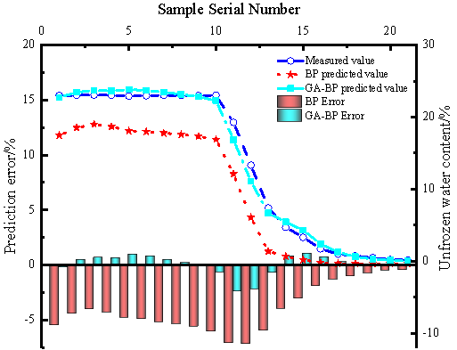 本文中,原始訓練樣本被隨機劃分為三組:訓練樣本、測試樣本和驗證樣本。首先,利用原始訓練樣本對網(wǎng)絡進行訓練,以實現(xiàn)最佳初始權重和閾值。通過解碼將初始權重、閾值及優(yōu)化值分配給神經網(wǎng)絡,訓練后獲得網(wǎng)絡訓練誤差曲線。然后,利用優(yōu)化后的網(wǎng)絡對凍土訓練樣本的未凍水含量進行預測,并通過對比預測值與實際值來評估網(wǎng)絡的擬合效果。本文采用未優(yōu)化的BP神經網(wǎng)絡作為對照組,預測結果如圖4所示。相較于BP神經網(wǎng)絡,遺傳算法優(yōu)化的BP神經網(wǎng)絡(GA-BP神經網(wǎng)絡)的預測誤差更小,變化更穩(wěn)定,表明其擬合值更接近訓練樣本的擬合值。此外,GA-BP神經網(wǎng)絡的收斂速度比BP神經網(wǎng)絡更快,能夠準確預測測試樣本的輸出值,從而實現(xiàn)未凍水含量的GA-BP神經網(wǎng)絡預測模型。