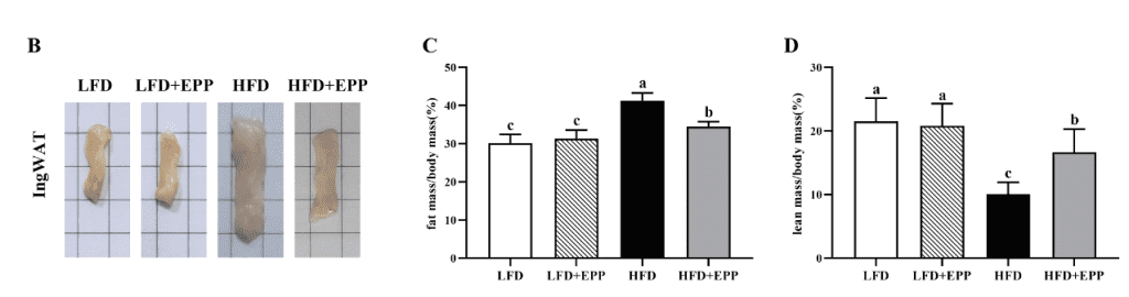 表1體重參數(shù)顯示,經(jīng)12周EPP處理后,HFD組小鼠的末次體重高于LFD組(23.24%,HFD與LFD比為44.60g與36.1g)和LFD+EPP組(23.96%,HFD與LFD+EPP比為44.60g與35.98g),HFD +EPP組小鼠的末次體重低于HFD組(9.19%,HFD與HFD+EPP比為44.60g與40.50g)。圖3B顯示所示,HFD組小鼠IngWAT的體重明顯增加,EPP組小鼠的體重明顯減少,與最終體重一致。