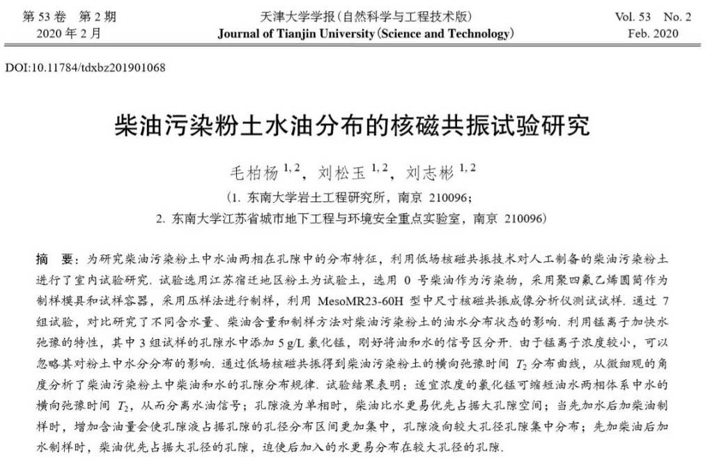 大家好,今天小編精挑細選了一篇在2020年2月剛剛出版在《天津大學學報》上的一篇文章,利用核磁共振技術研究柴油污染粉土中水油在孔隙中的分布規(guī)律,研究過程并不復雜,但結果很有意思,希望對大家有所幫助!