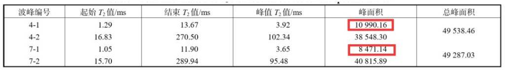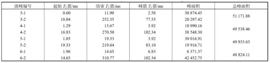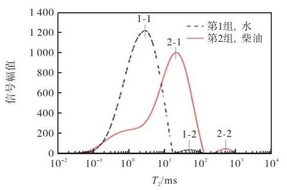 第 4 組和第 7 組試樣的總峰面積幾乎相等,這說明配制的樣品是可靠的。進一步分析發(fā)現(xiàn),發(fā)現(xiàn)第 7 組的第 1 峰面積略小于第 4 組的第 1 峰 面積?! ∠鄳?,第 7 組的第 2 峰面積略大于第 4 組的 第 2 峰面積.由于第 2 峰主要由柴油的核磁信號構 成,第 1 峰主要由 MnCl2溶液的核磁信號構成,因此,相較于制樣時第 1 相為水的情況,第 1 相為柴油時,柴油優(yōu)先進入較大孔徑的孔隙,后加入的水更多地進入大孔徑的孔隙。