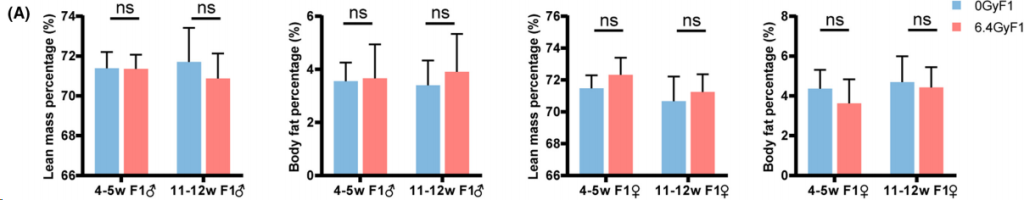 圖表中清晰展示了 Fat Mass (脂肪量) 和 Lean Mass (瘦肉量) 隨周齡增長的動態(tài)變化。 對照組 vs 照射組: 通過QMR的精準(zhǔn)定量,研究發(fā)現(xiàn)兩組后代在成年期的體成分無顯著差 異。