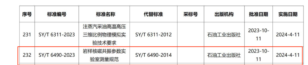 國家能源局于2023年10月11日發(fā)布《中華人民共和國石油天然氣行業(yè)標(biāo)準(zhǔn)》,從2024年4月11日起施行。其中《巖樣核磁共振參數(shù)實驗室測量規(guī)范》明確規(guī)定了,實驗室測量巖樣核磁共振參數(shù)的主要測量儀器、主要試劑制備、巖樣制備、巖樣測量、結(jié)果處理和允許不確定度的要求。適用于巖樣或巖屑核磁共振參數(shù)的測量。